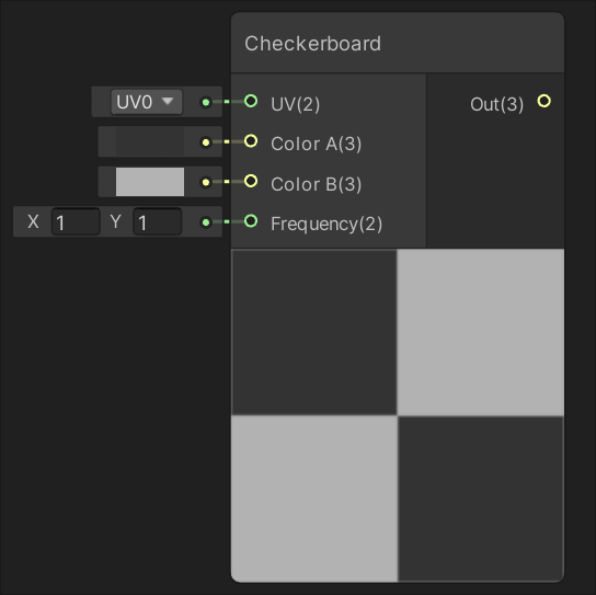 Generates a checkerboard of alternating colors between inputs Color A and Color B based on input UV.