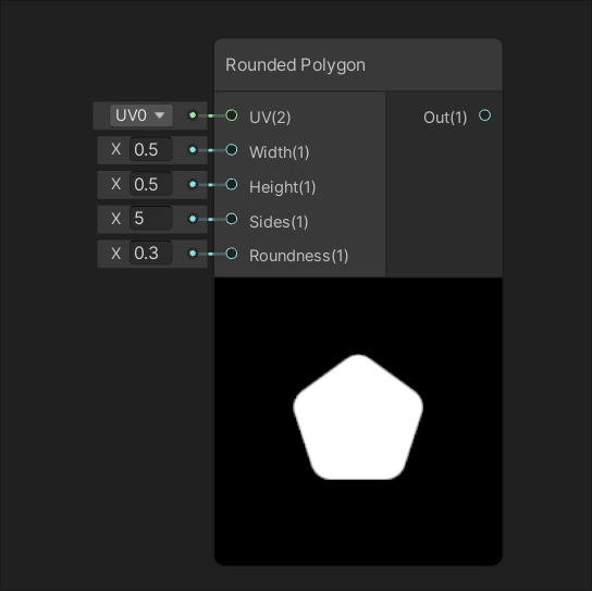 Generates a rounded polygon shape based on input UV at the size specified by inputs Width and Height. The input Sides specifies the number of sides, and the input Roundness defines the roundness of each corner.