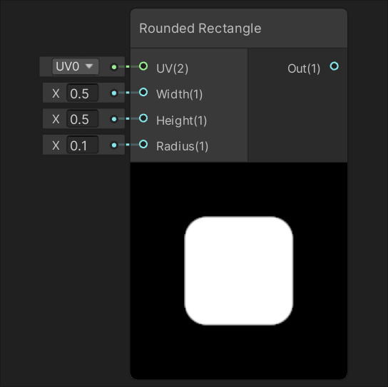 Generates a rectangle shape based on input UV at the size specified by inputs Width and Height. Generates a rounded rectangle shape based on input UV at the size specified by inputs Width and Height. The input Radius defines the radius of each corner.