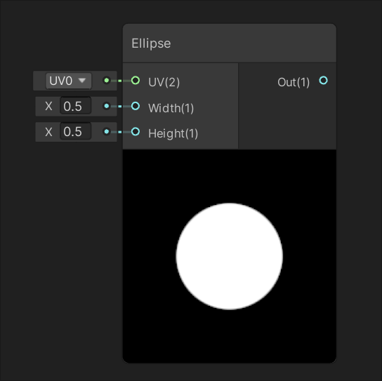 | Generates an ellipse shape based on input UV at the size specified by inputs Width and Height. | Generates a regular polygon shape based on input UV at the size specified by inputs Width and Height. The polygon's amount of sides is determined by input Sides. |